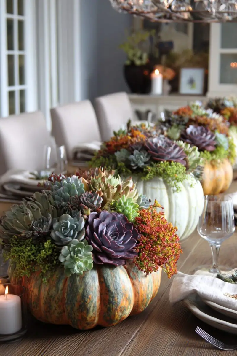 Create living centerpieces using pumpkins as planters filled with succulents for a modern, sustainable Halloween decoration.