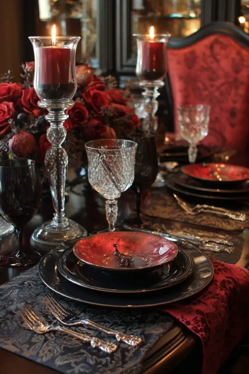 Combine rich velvet textures with sparkling crystals to create a Gothic glamour tablescape that feels both haunting and luxurious.