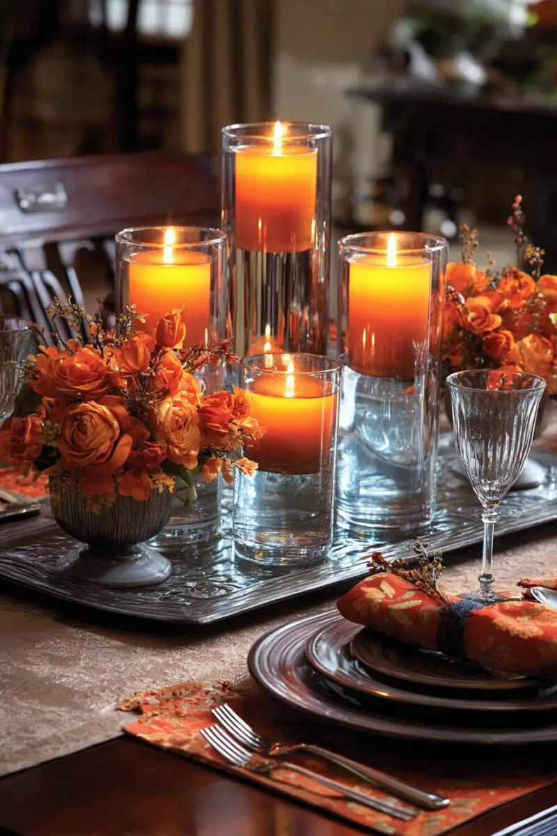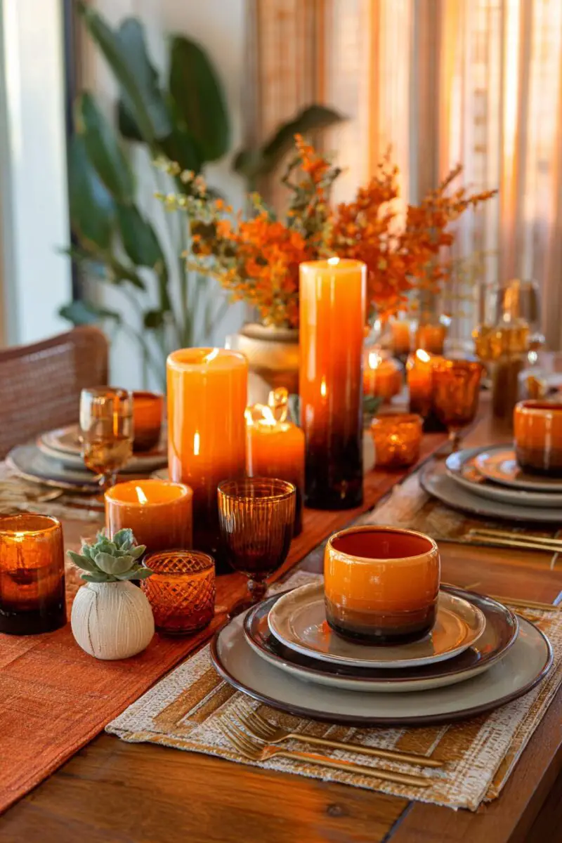 Start with orange elements at one end of your table including bright pumpkins, orange candles, and coral flowers.
