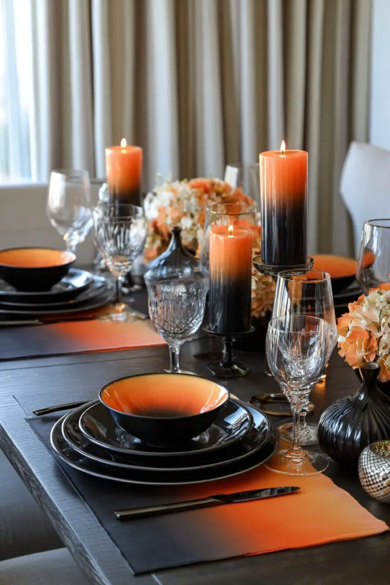 Create a stunning visual flow across your table using an ombre color scheme that transitions from bright orange to deep black.