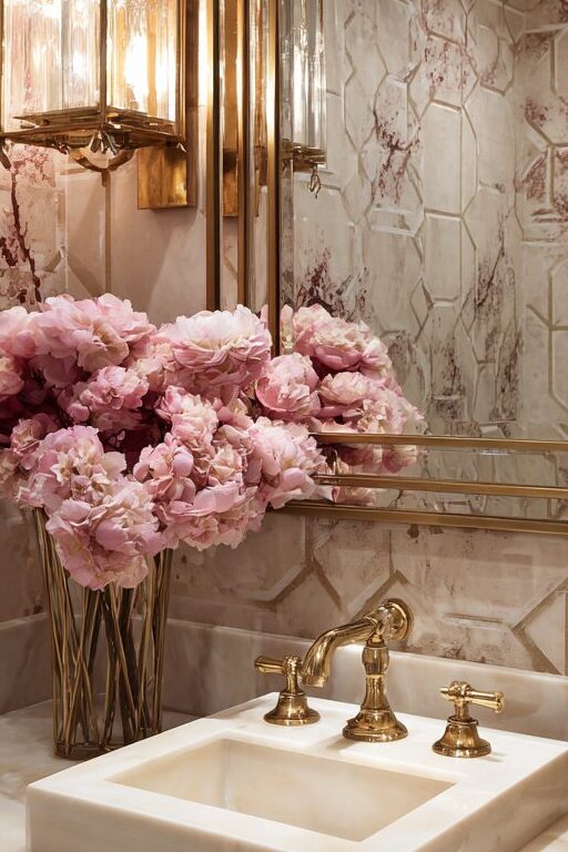 When selecting gold fixtures, consider unlacquered brass that will develop a beautiful patina over time, giving your space that authentic aged Hollywood feel.