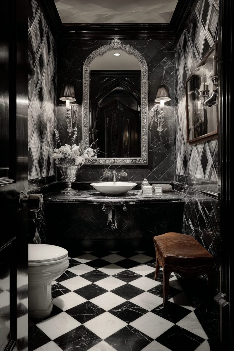 You can go bold with a checkerboard floor that immediately communicates vintage glamour and sophisticated drama.