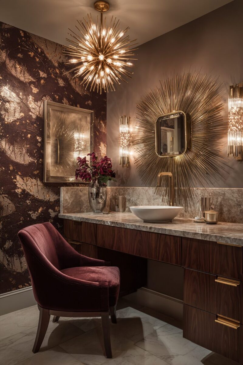 You’ll find that even small metallic touches catch the eye dramatically in a powder room’s intimate setting.