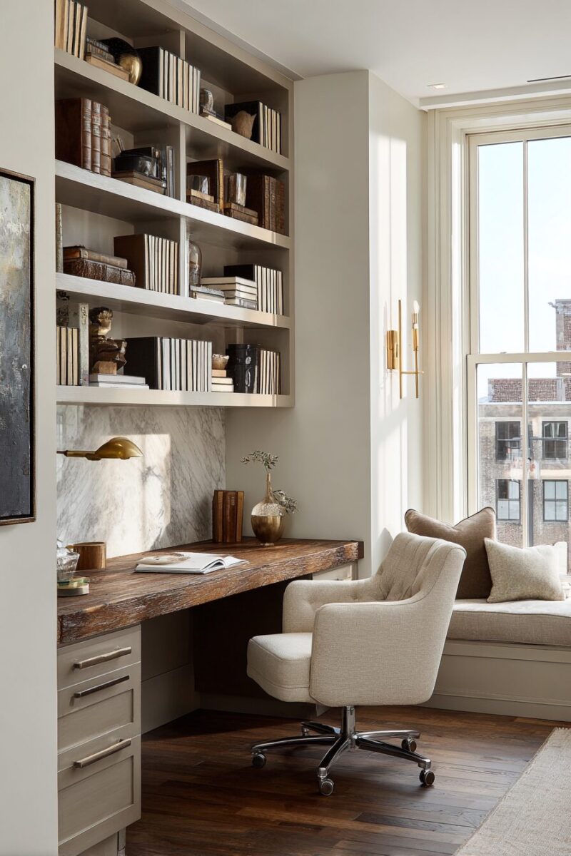 Floating shelves installed above your desk provide accessible storage while creating architectural interest.