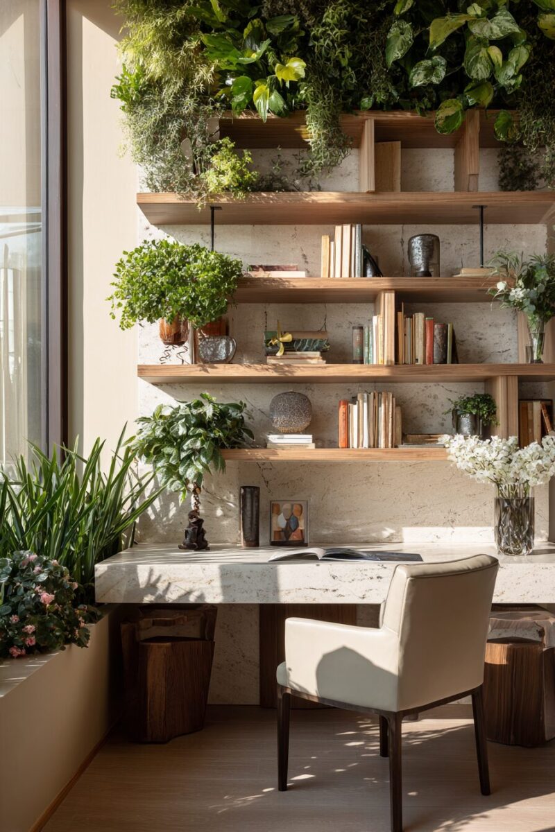 Beyond traditional plants, preserved moss walls or framed botanical specimens provide natural elements without maintenance requirements.