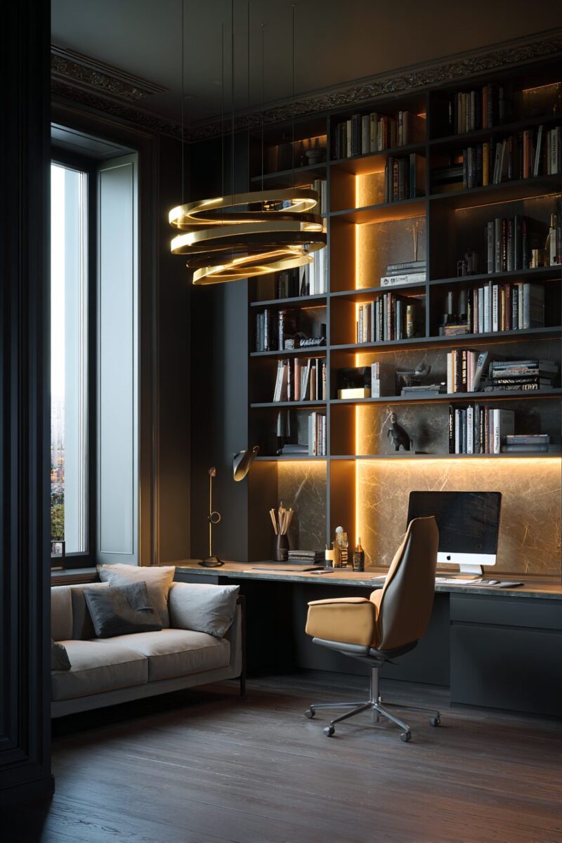 Strategic lighting serves as both functional necessity and design statement in any effective home office.