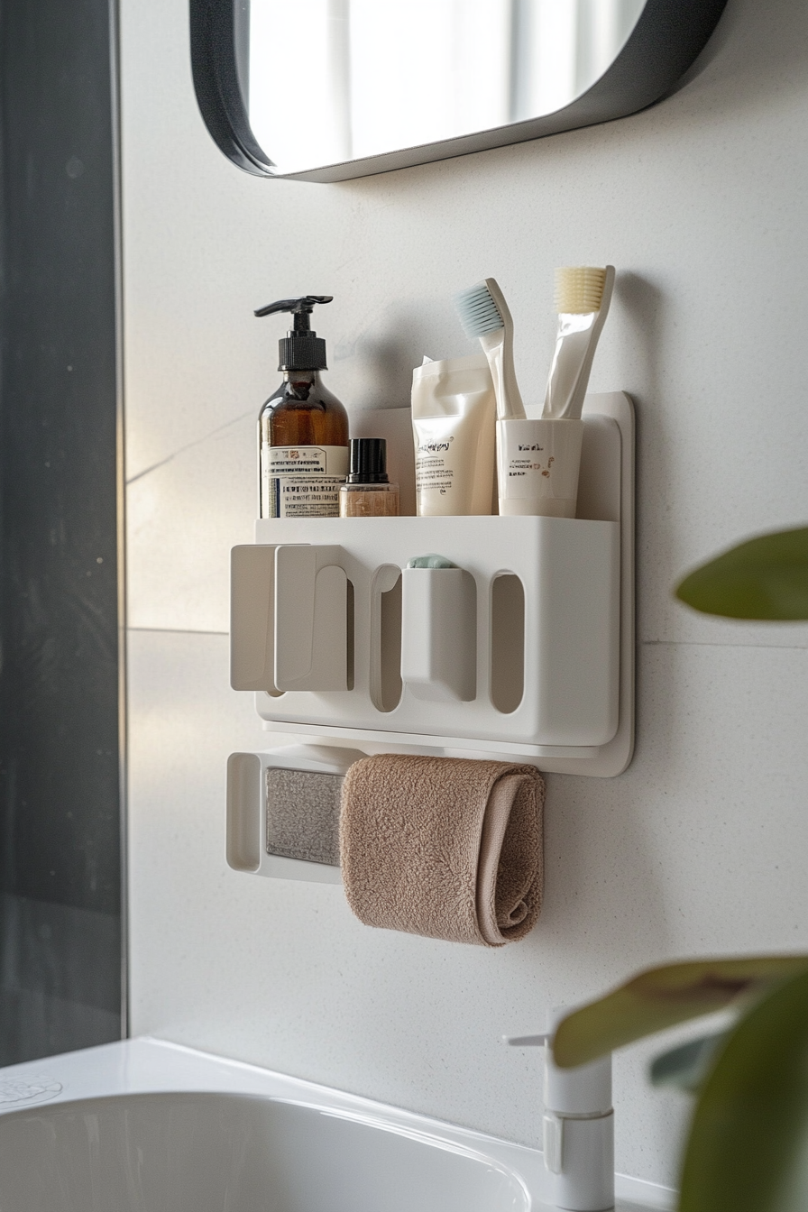 – Bathroom mounted caddies made of bamboo, wire, or steel to contain toiletries and accessories.