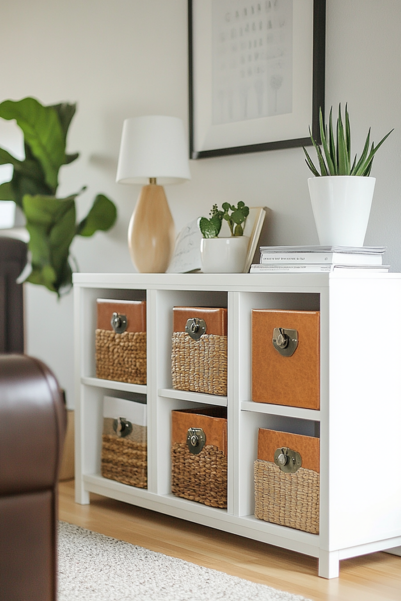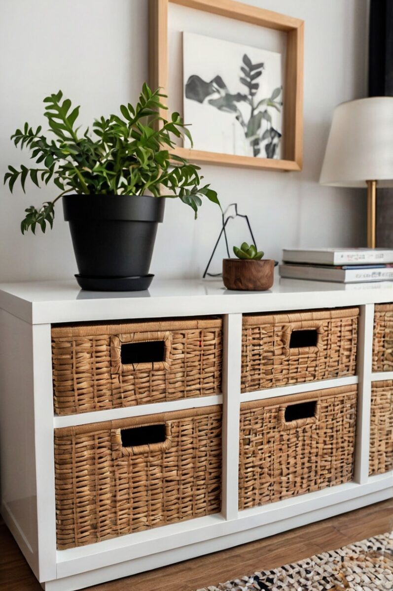 Instead of the plain fabric boxes that IKEA sells, invest in decorative storage bins made from materials like woven rattan, seagrass, or leather.