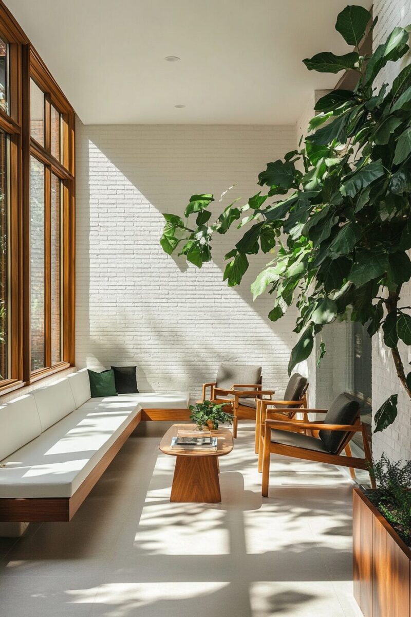 A minimalist sunroom creates a sense of calm through clean lines, uncluttered spaces, and a carefully curated selection of statement plants.