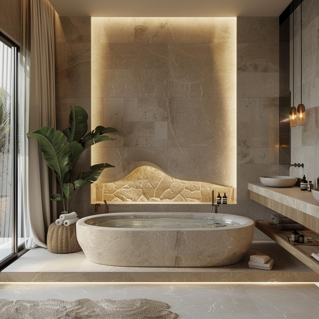 Natural stone tile like marble or slate along the walls and floors boosts the Zen ambience.