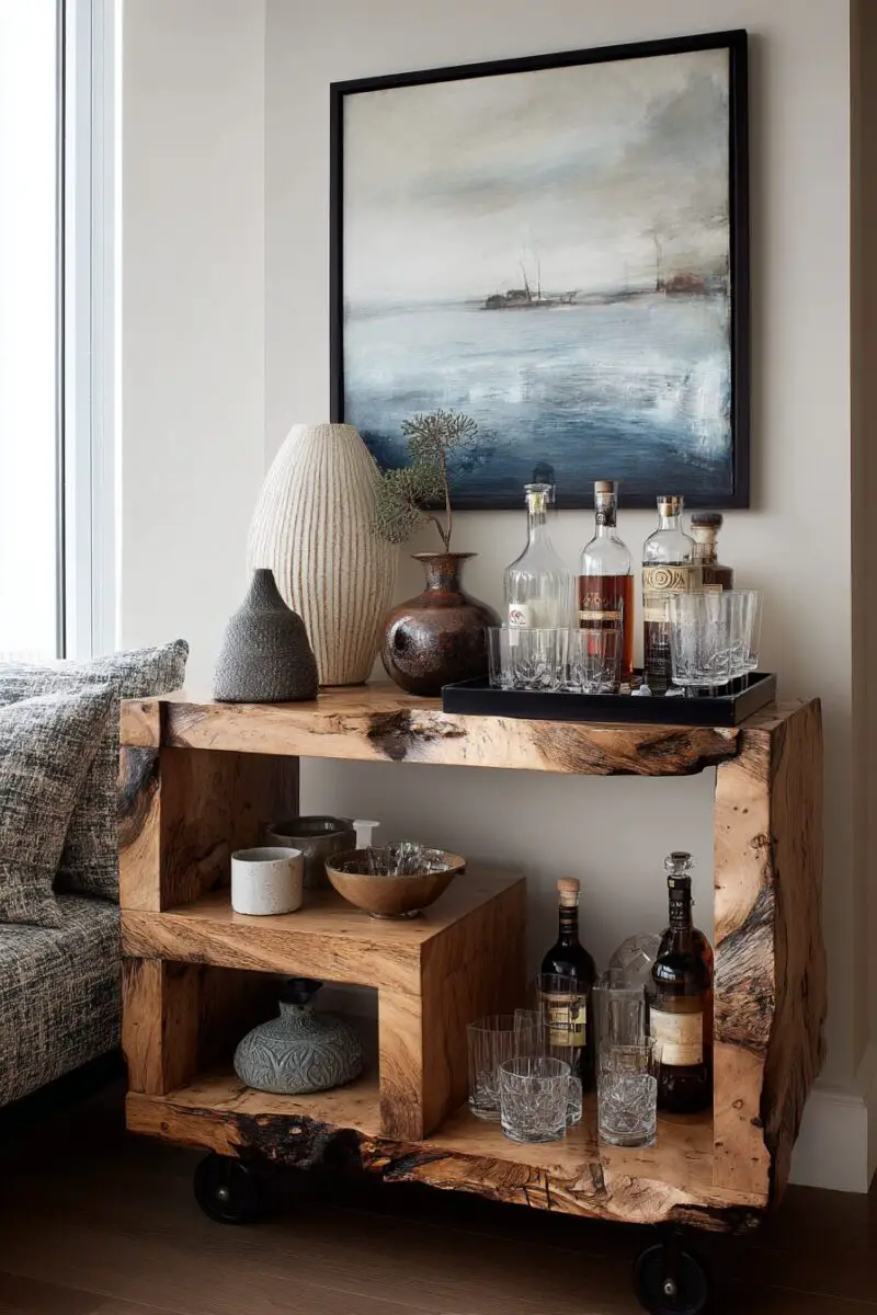 Install a solid wood bar top, preferably in rich mahogany or walnut, with enough depth to accommodate proper bartending and comfortable leaning.