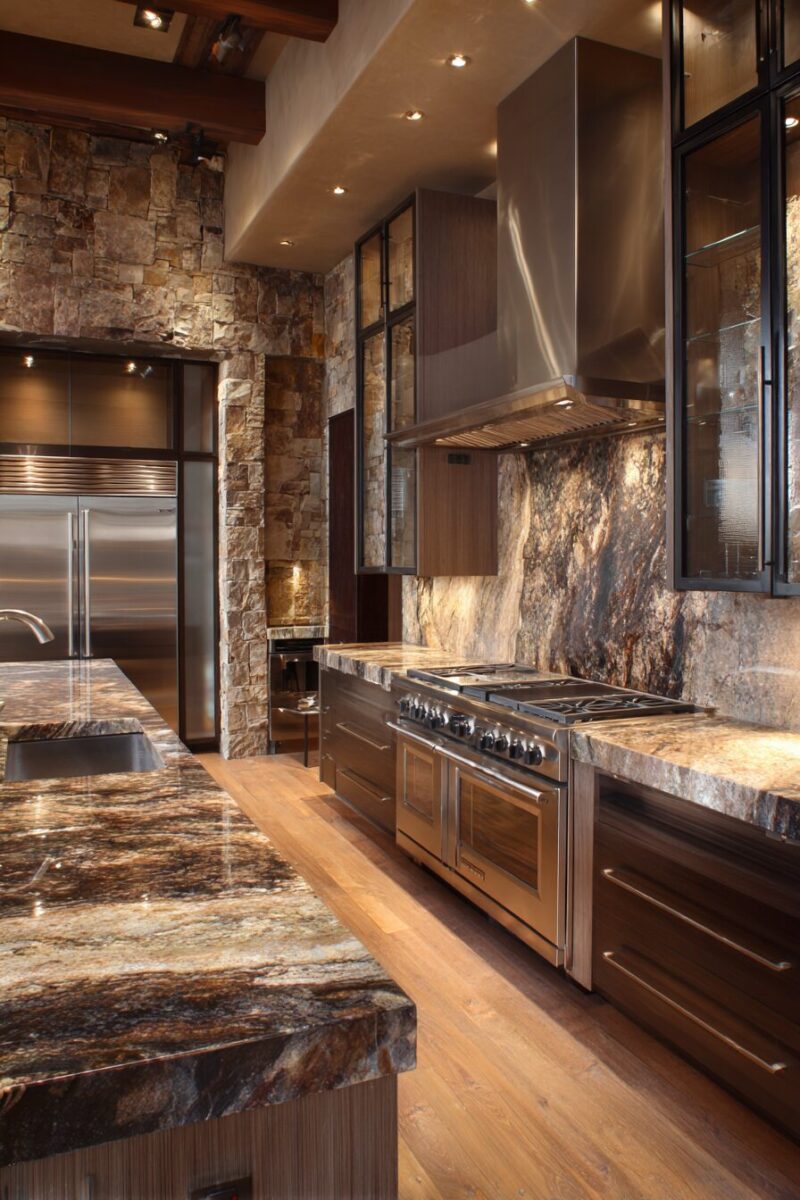 You’ll appreciate how the varied tones in natural stone pick up different shades within your brown cabinetry.