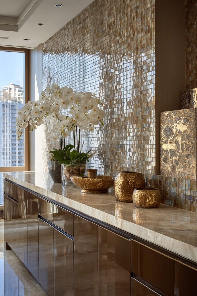 You’ll love how glass mosaics reflect both natural and artificial light, making your kitchen feel brighter and more spacious.