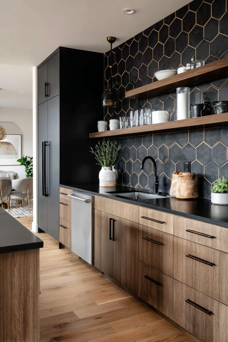 Black hexagon tiles create a dramatic, modern statement that transforms brown cabinets into the ultimate design feature.