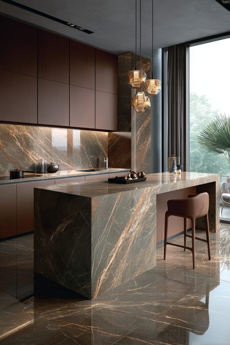 Marble look porcelain slabs bring luxury and elegance to kitchens with brown cabinets without the maintenance headaches of real marble.