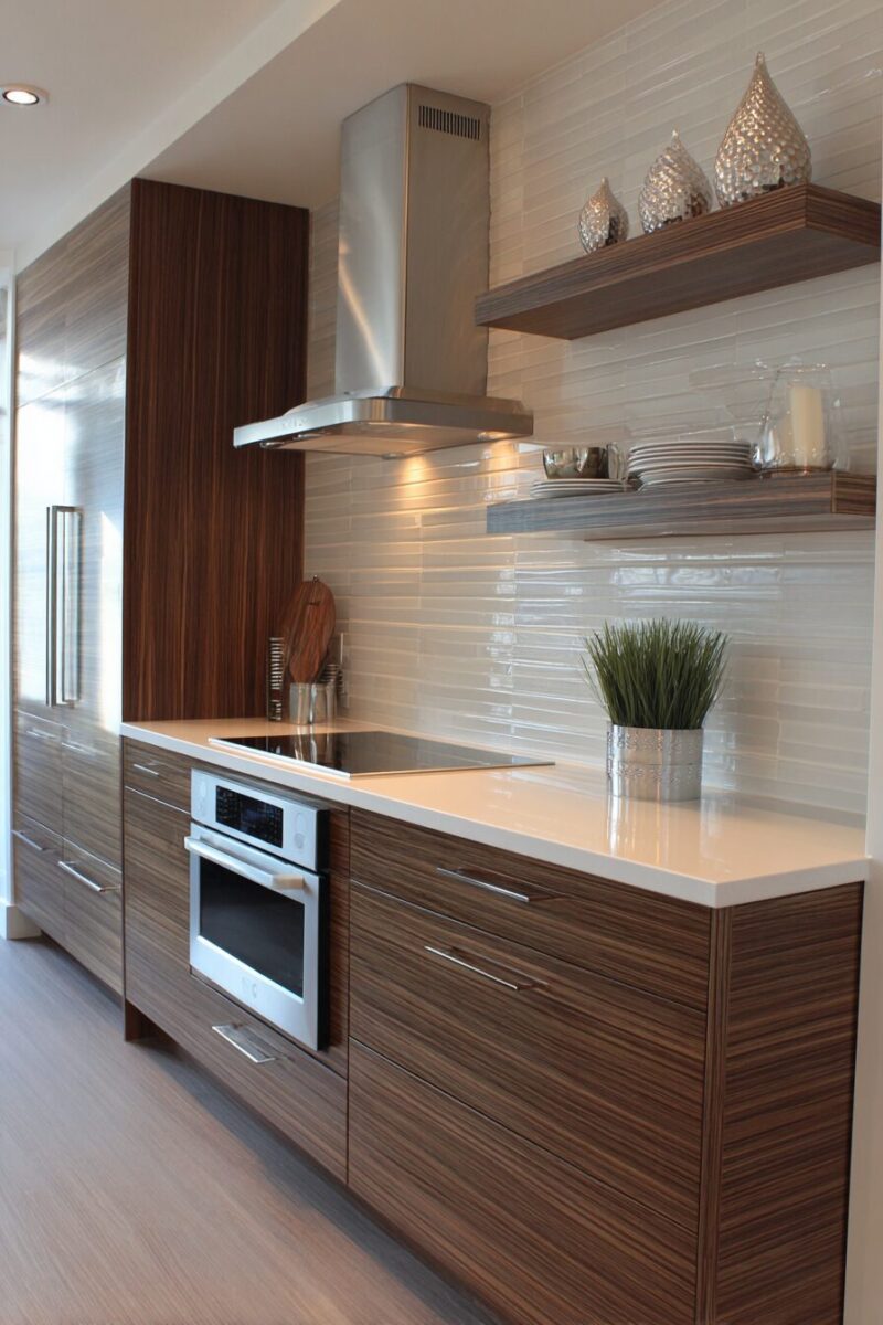 Metallic accent strips integrated with white subway tiles create modern elegance that complements brown cabinets perfectly.