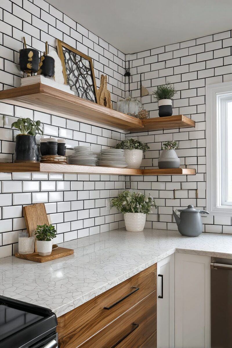 The clean lines and geometric pattern of subway tiles provide the perfect backdrop for showing off beautiful dishes, artwork, or decorative objects on open shelving.