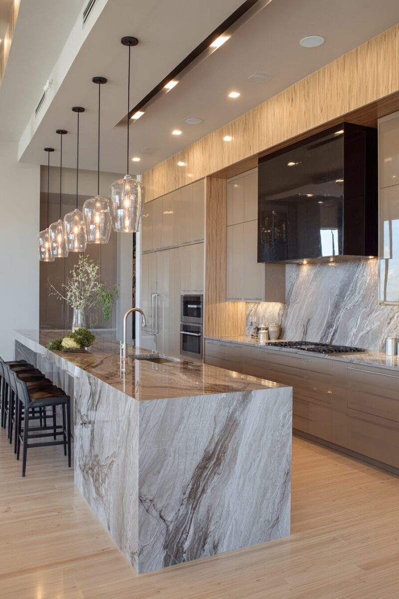 You can extend the slabs from backsplash to ceiling for a dramatic statement wall that transforms your entire kitchen.