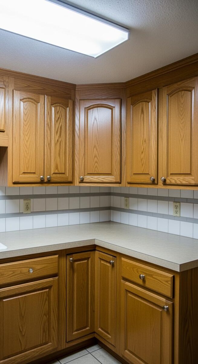 If your cabinets have that warm, honey-oak glow, I’m willing to bet they were installed sometime when everyone thought wood tones had to be orange.