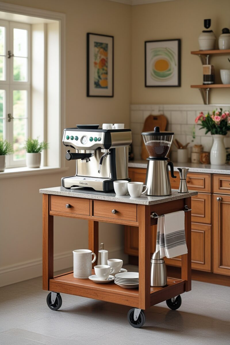 A rolling cart is like having a coffee shop on wheels that you can move literally anywhere you need it in your small kitchen.