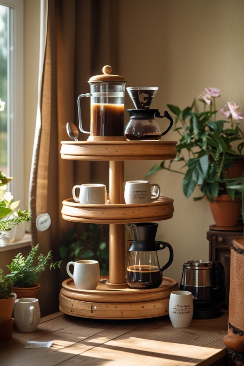 A corner carousel coffee station transforms that awkward space into a rotating command center for all your coffee needs.