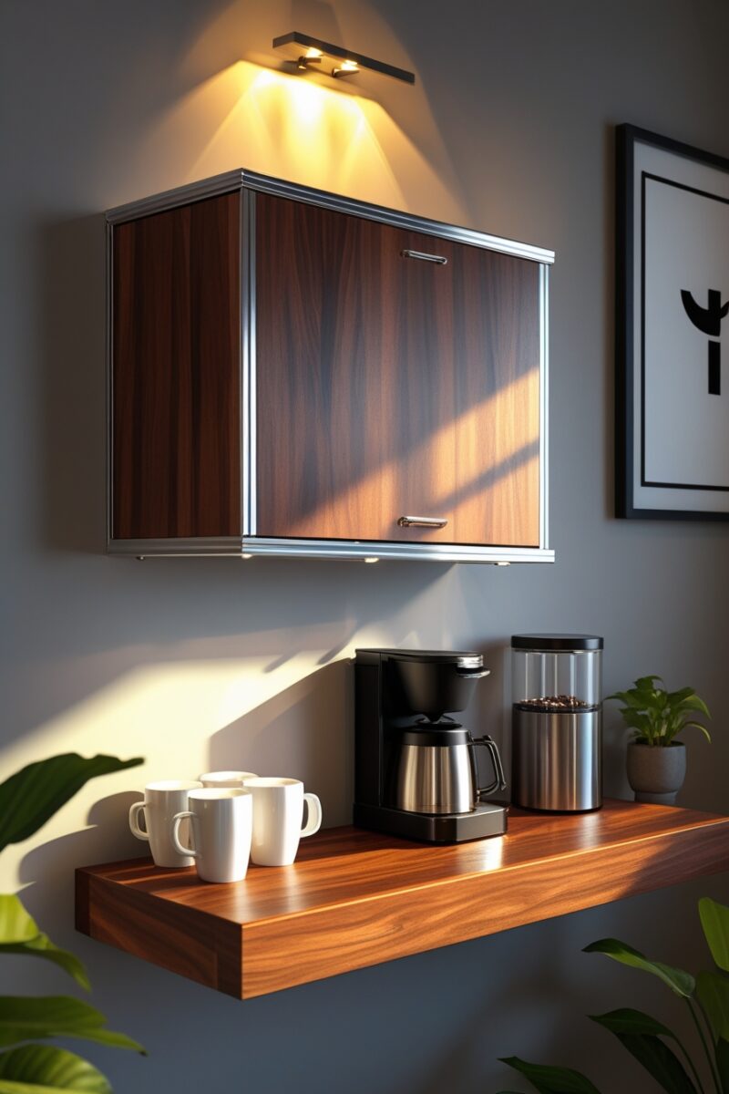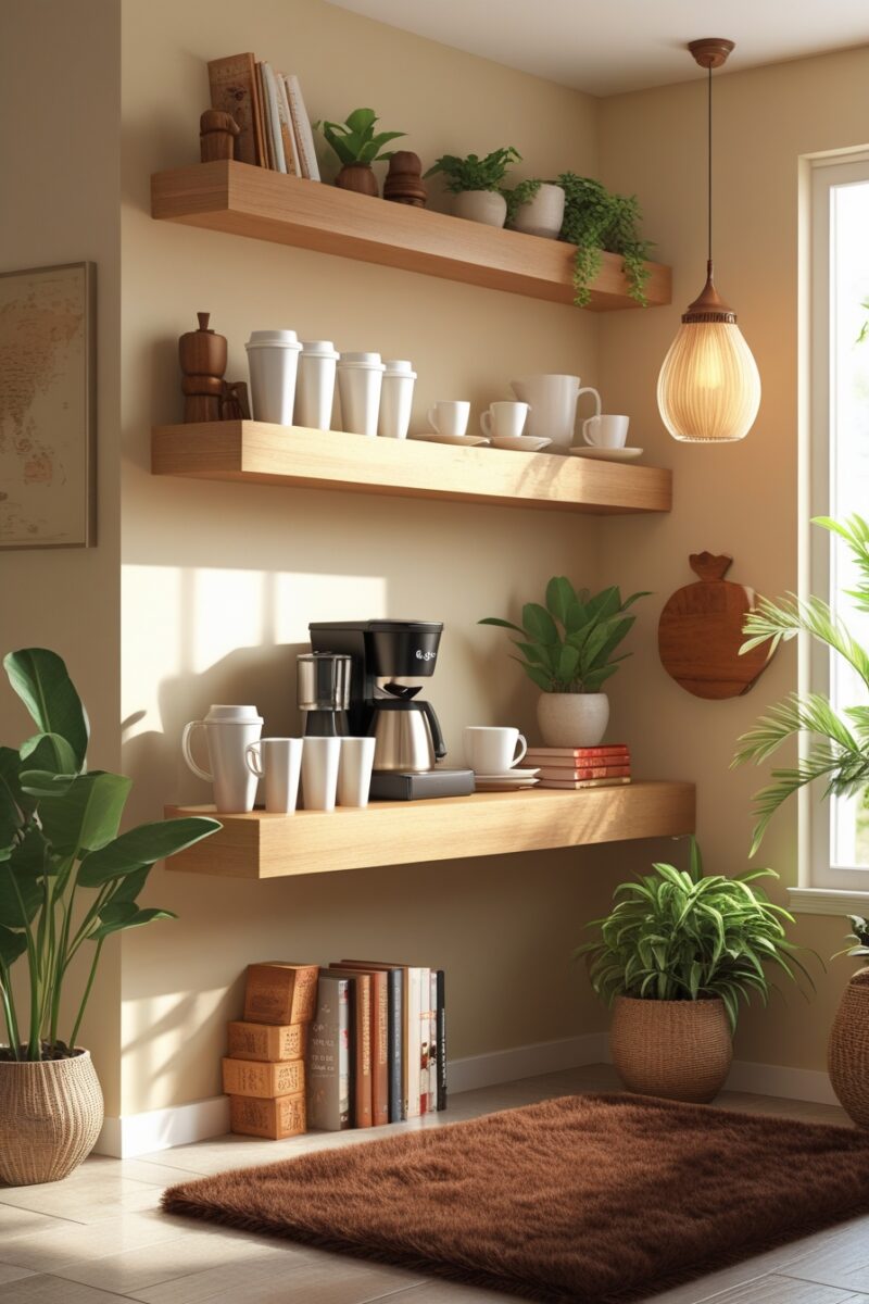 Floating shelves create the illusion of more space while actually giving you a dedicated coffee zone that feels intentional and designed.
