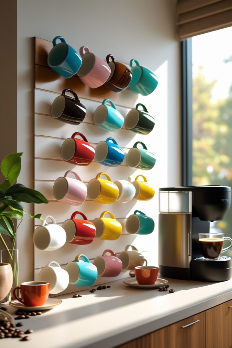 Add pegboard hooks for hanging mugs by their handles, displaying them in a way that’s accessible and adds visual interest to your wall.