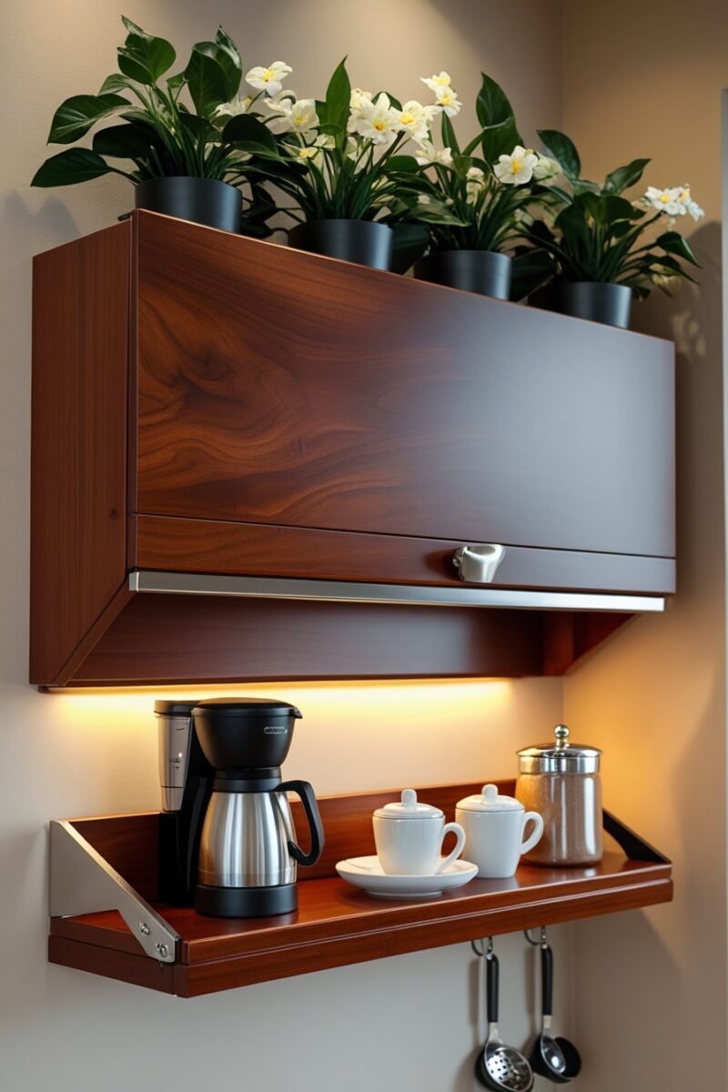 Install a small shelf above your fold-down bar to store your coffee beans, filters, and other supplies that you want within easy reach.