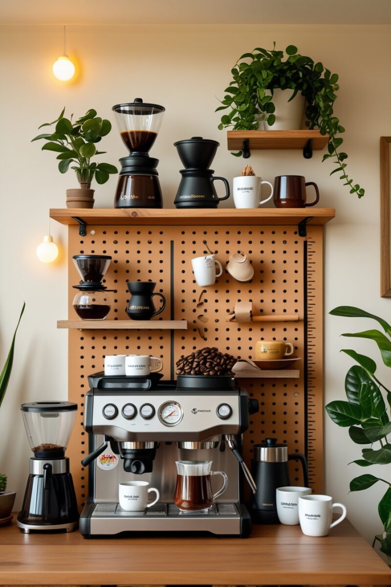 A pegboard coffee wall turns vertical space into a customizable, rearrangeable coffee station that looks like it belongs in a trendy café.