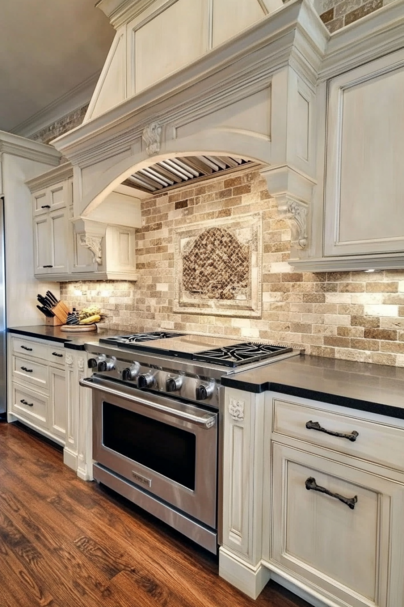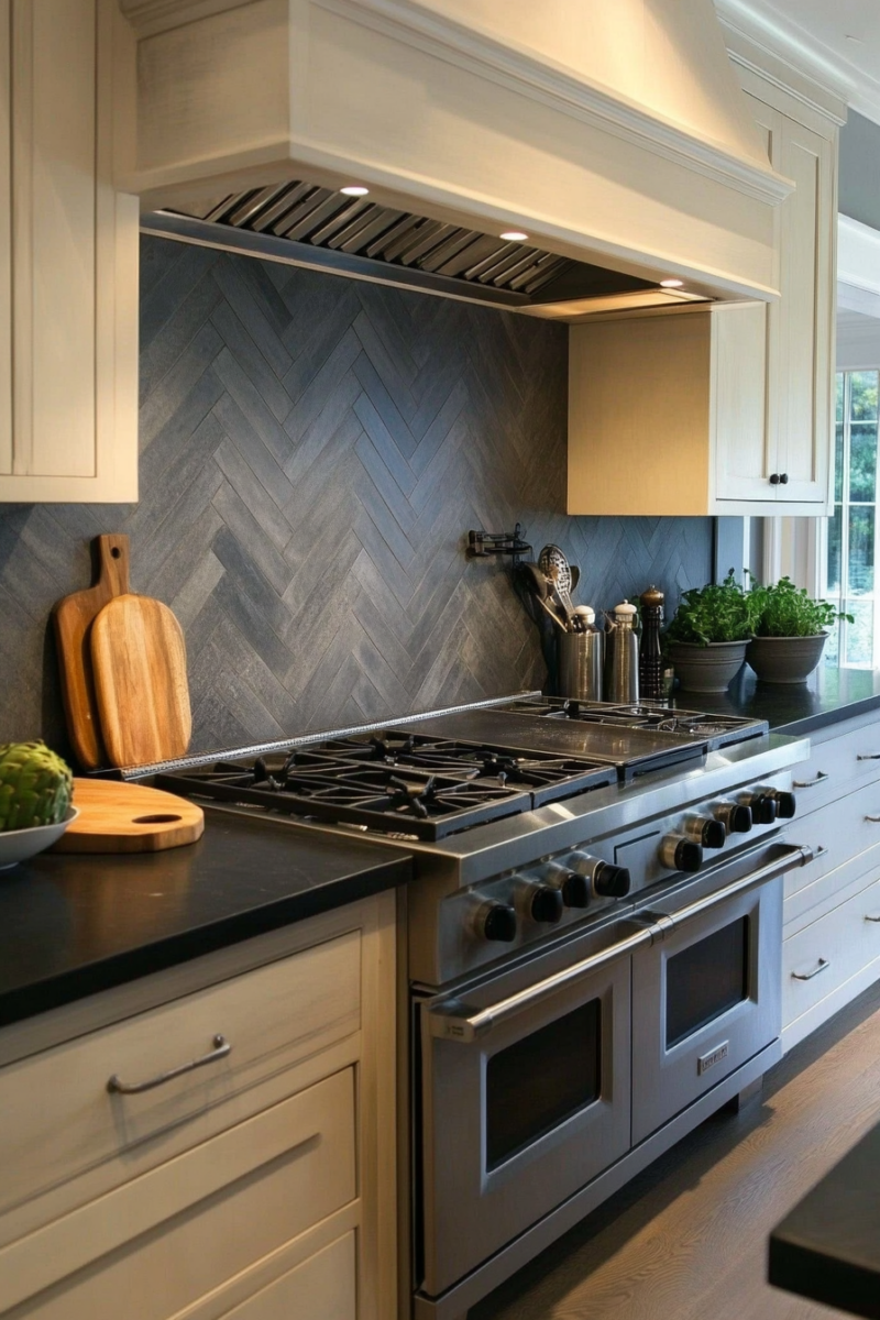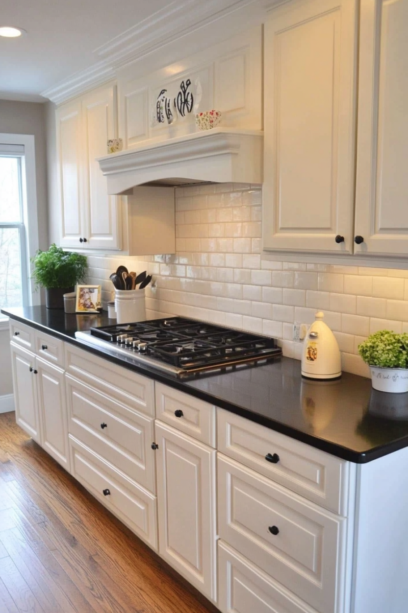 A white or marble backsplash can add elegance, while natural wood accents bring in warmth and texture.