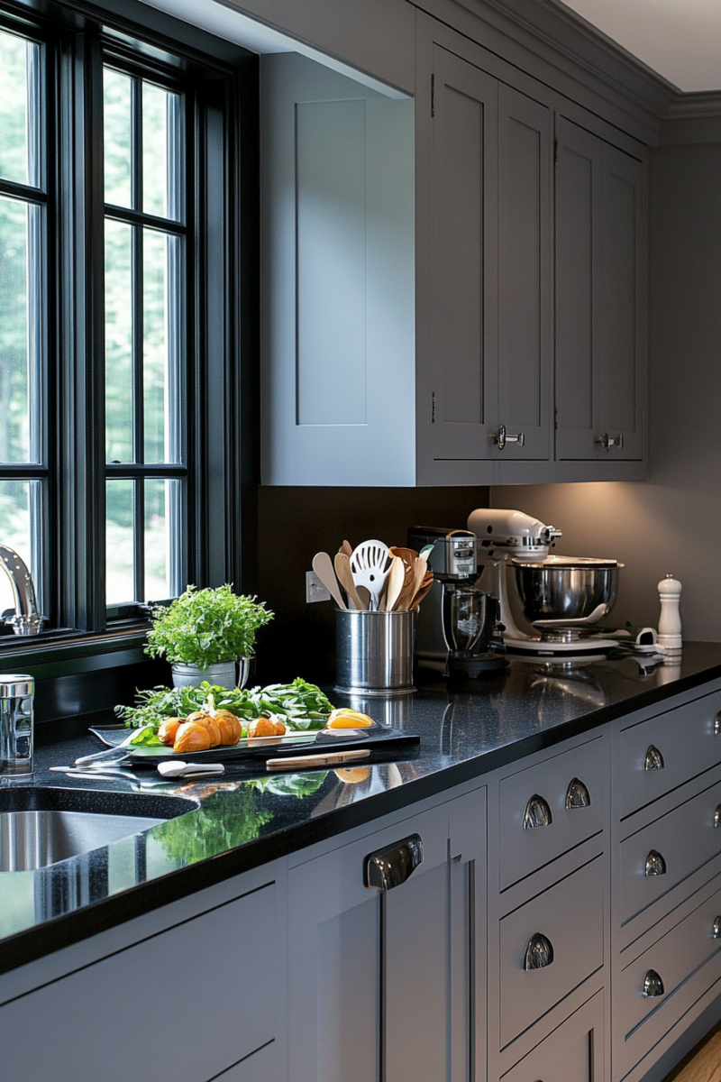 Charcoal works beautifully for cabinets, creating a seamless look that lets your black countertops shine.