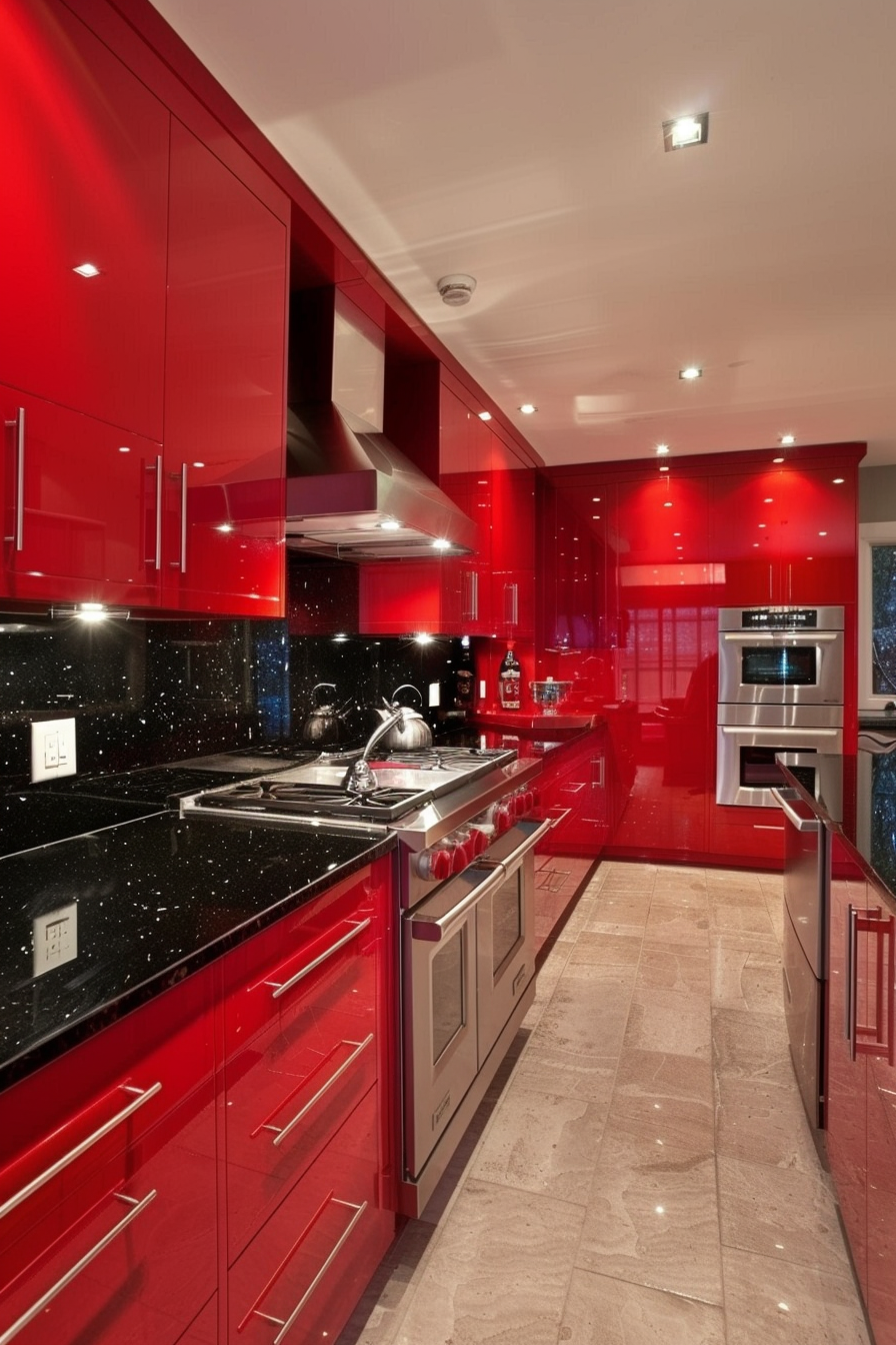 The contrast between the black countertops and red accents creates a striking, high-energy space that commands attention.