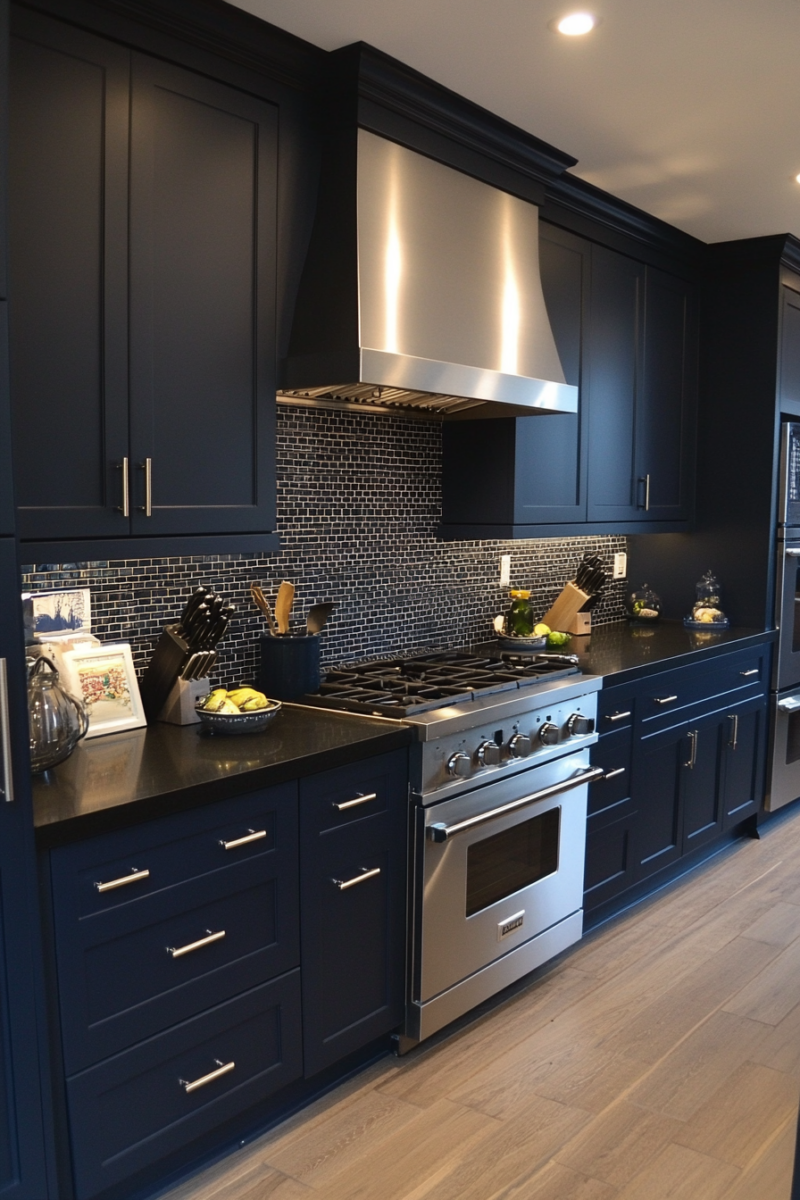 Navy cabinets paired with black countertops look sleek and modern, especially if you go for a matte finish.