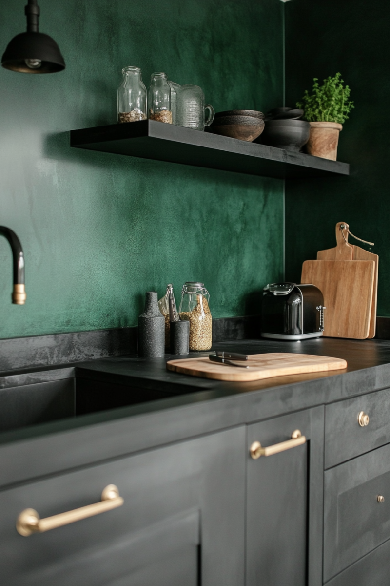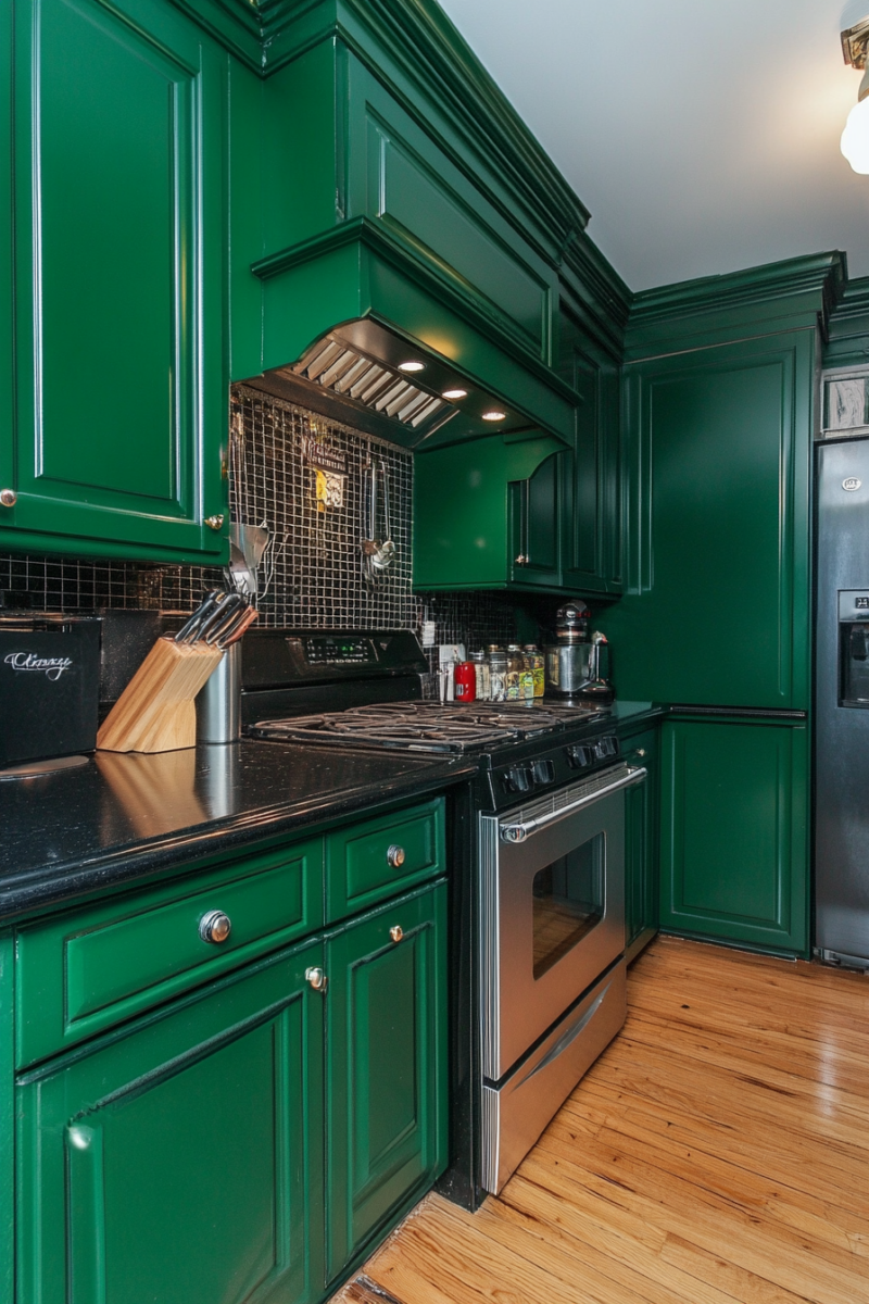 For cabinets, a deep green hue can create a bold, luxurious look when paired with sleek black countertops.