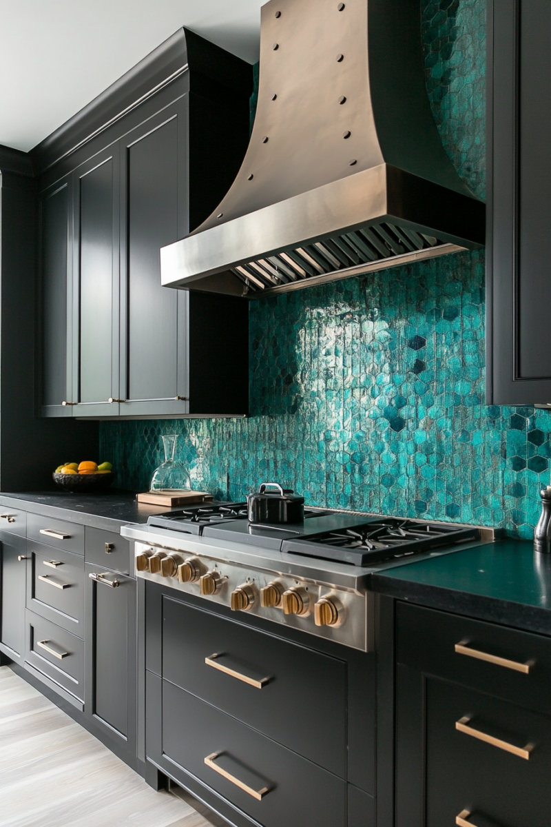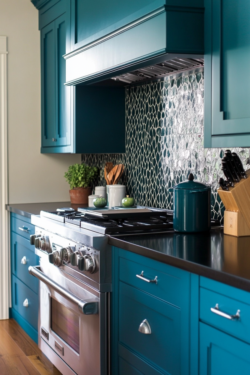 For cabinets, a rich teal can create a striking contrast with black countertops, especially when paired with white walls or a light backsplash.