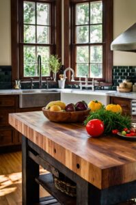Butcher block provides a durable, heat-resistant surface that’s perfect for families who actually use their dining tables for cooking prep and daily meals.