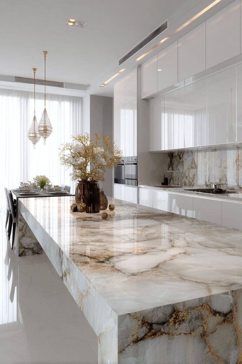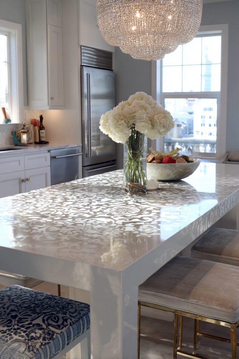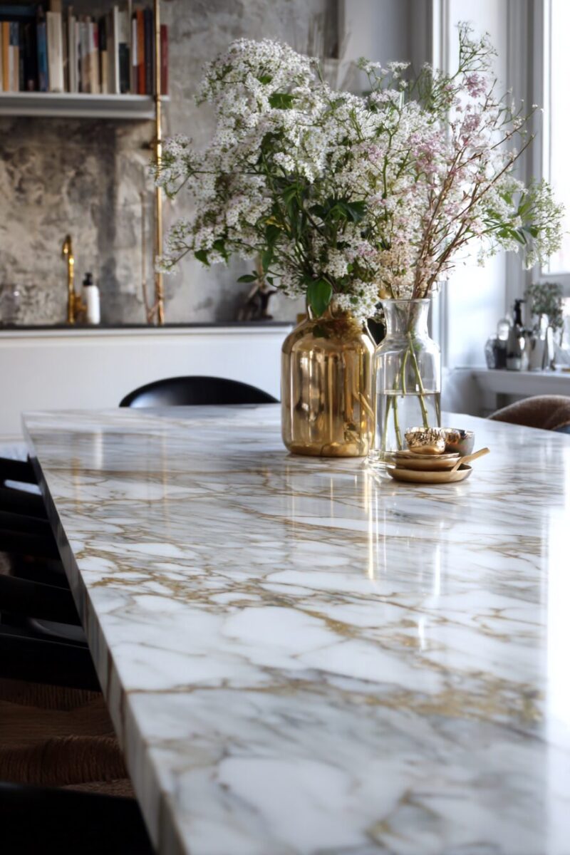 Choose a marble pattern that complements your kitchen’s existing finishes – Carrara marble patterns work beautifully with white and gray color schemes.