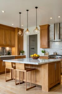 The muted tone will complement the natural warmth of the cabinets without feeling overpowering.