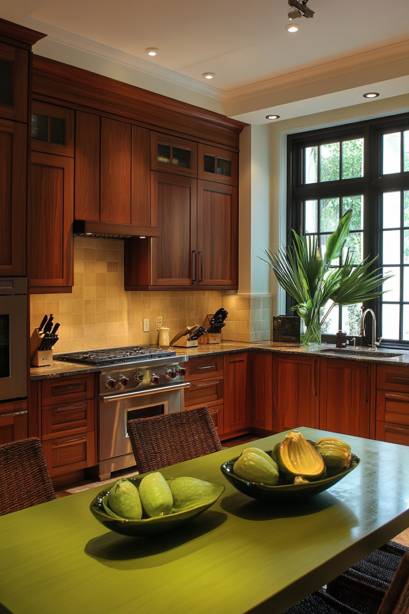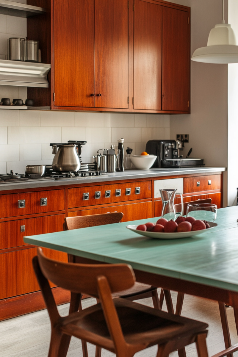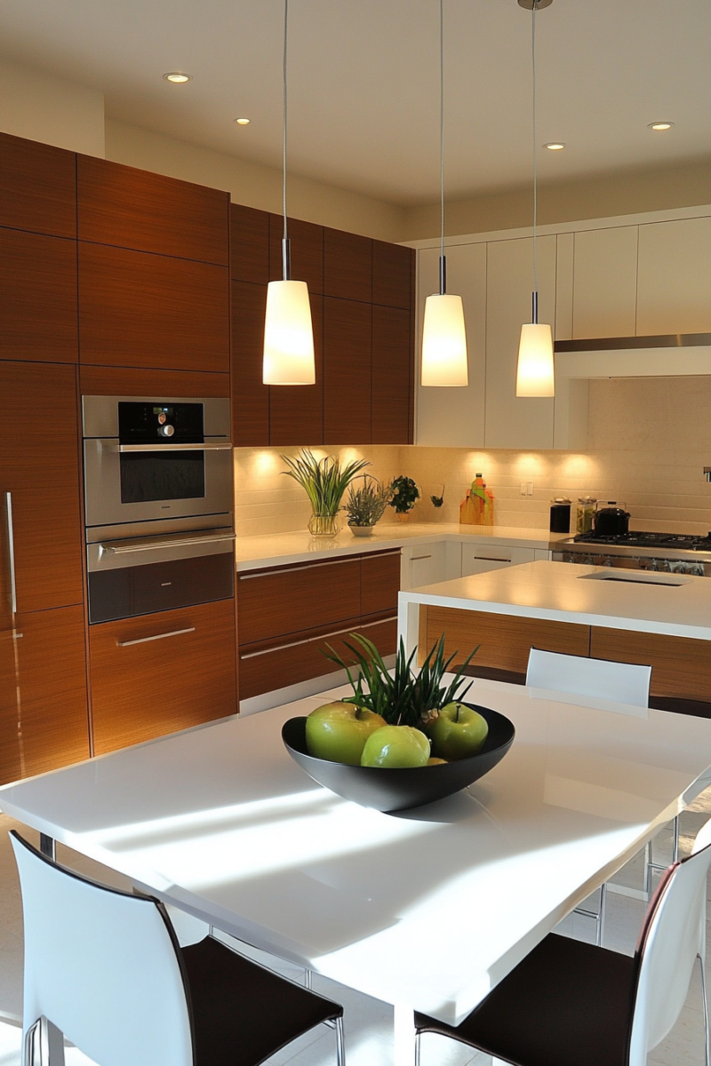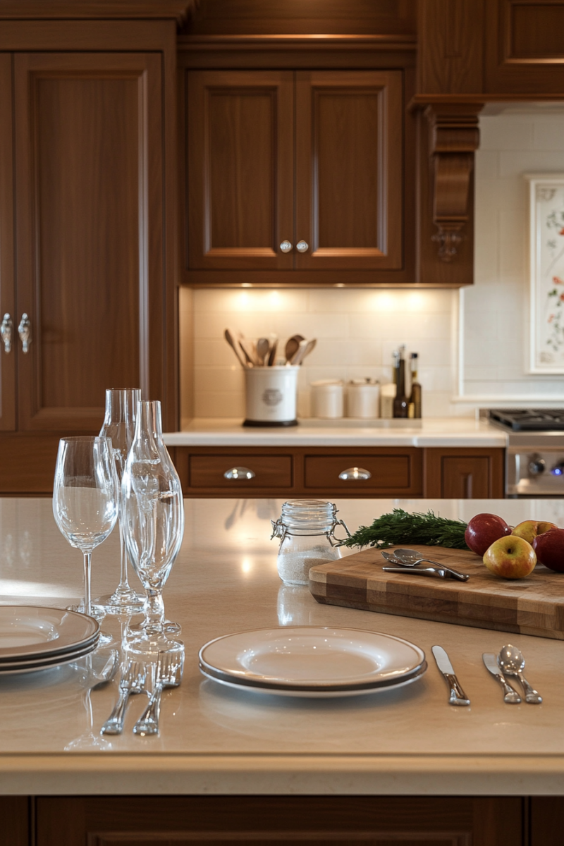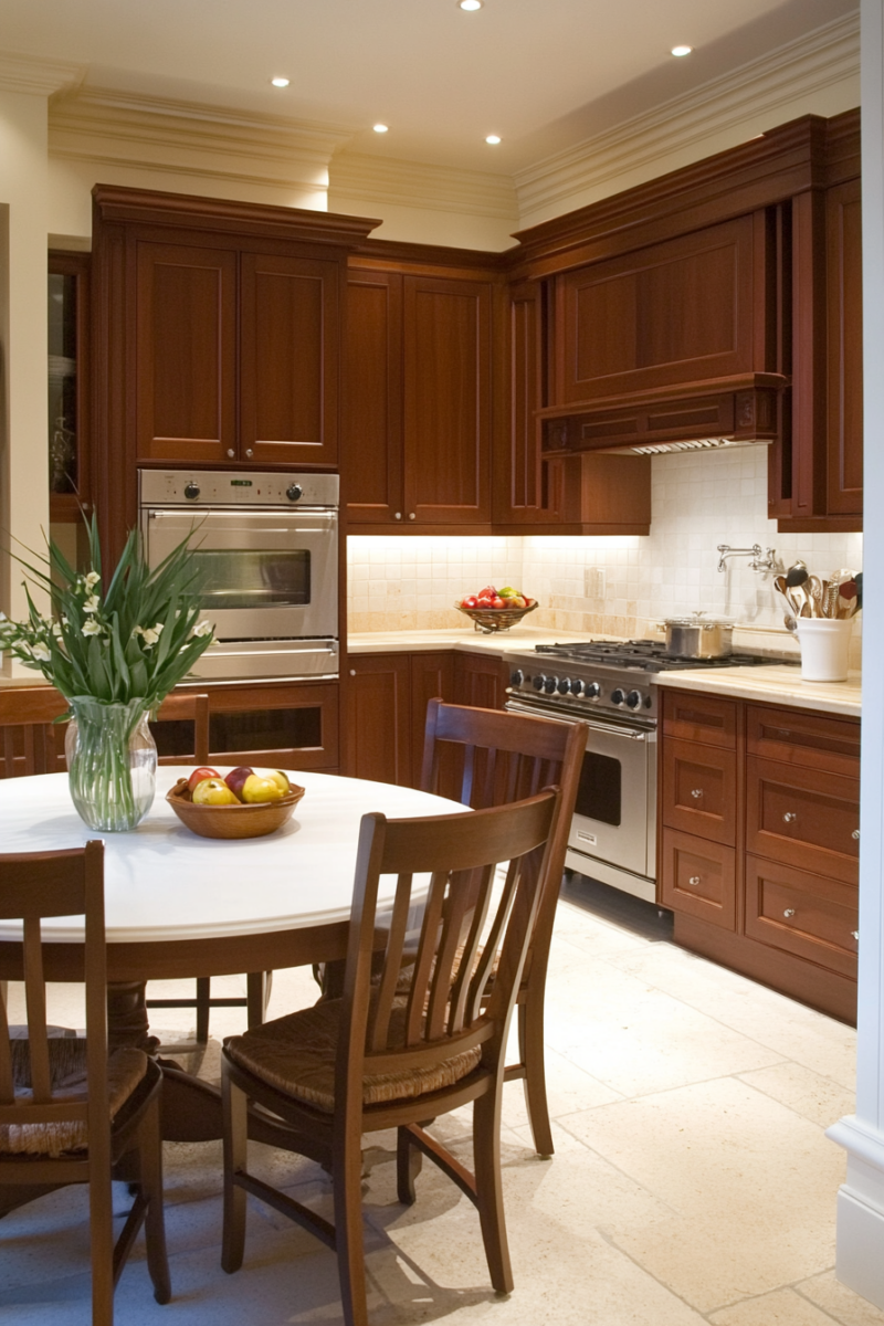 This will help the table maintain an understated, sophisticated look that complements the warmth of the cabinets.