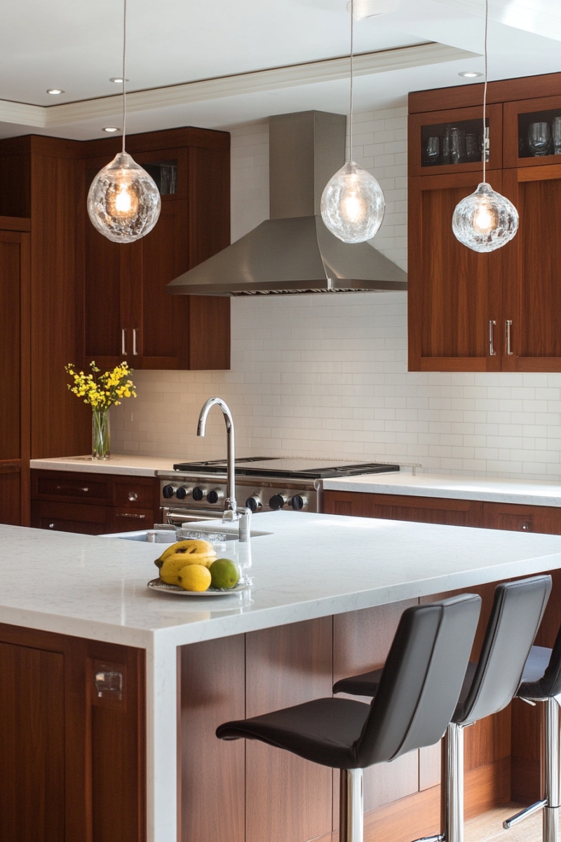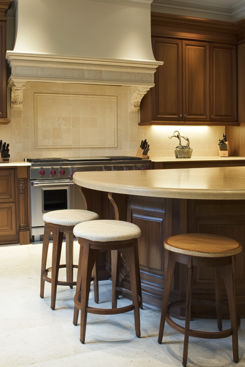 In a more traditional kitchen, add soft textures like a woven table runner or upholstered chairs to soften the look.