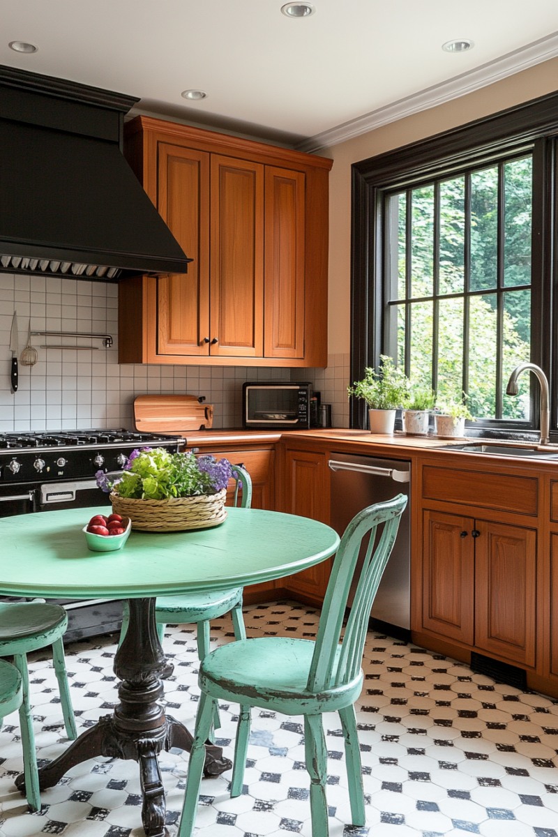 This choice is perfect if you want a table that feels fresh and inviting without stealing attention from your gorgeous cabinets.