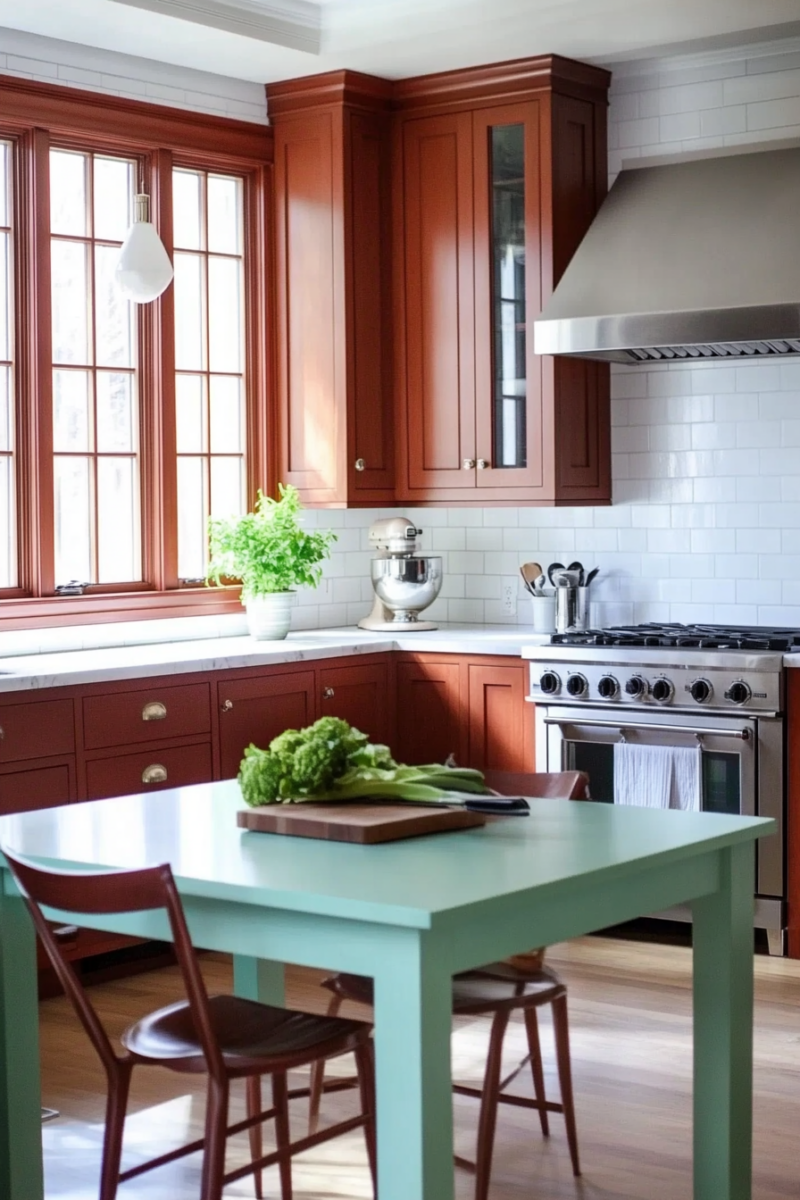 If you want to embrace the warm, cozy vibe of your cherry cabinets, rustic barn red is an excellent choice for your kitchen table.