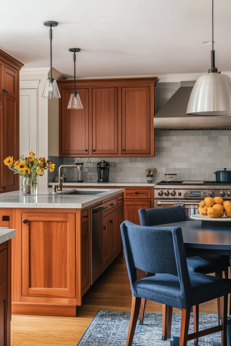 This earthy tone pairs beautifully with cherry cabinets, creating a warm, organic vibe that instantly feels cozy and inviting.