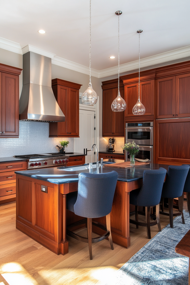 It’s a color that exudes sophistication and brings a modern touch to a space dominated by cherry cabinets.