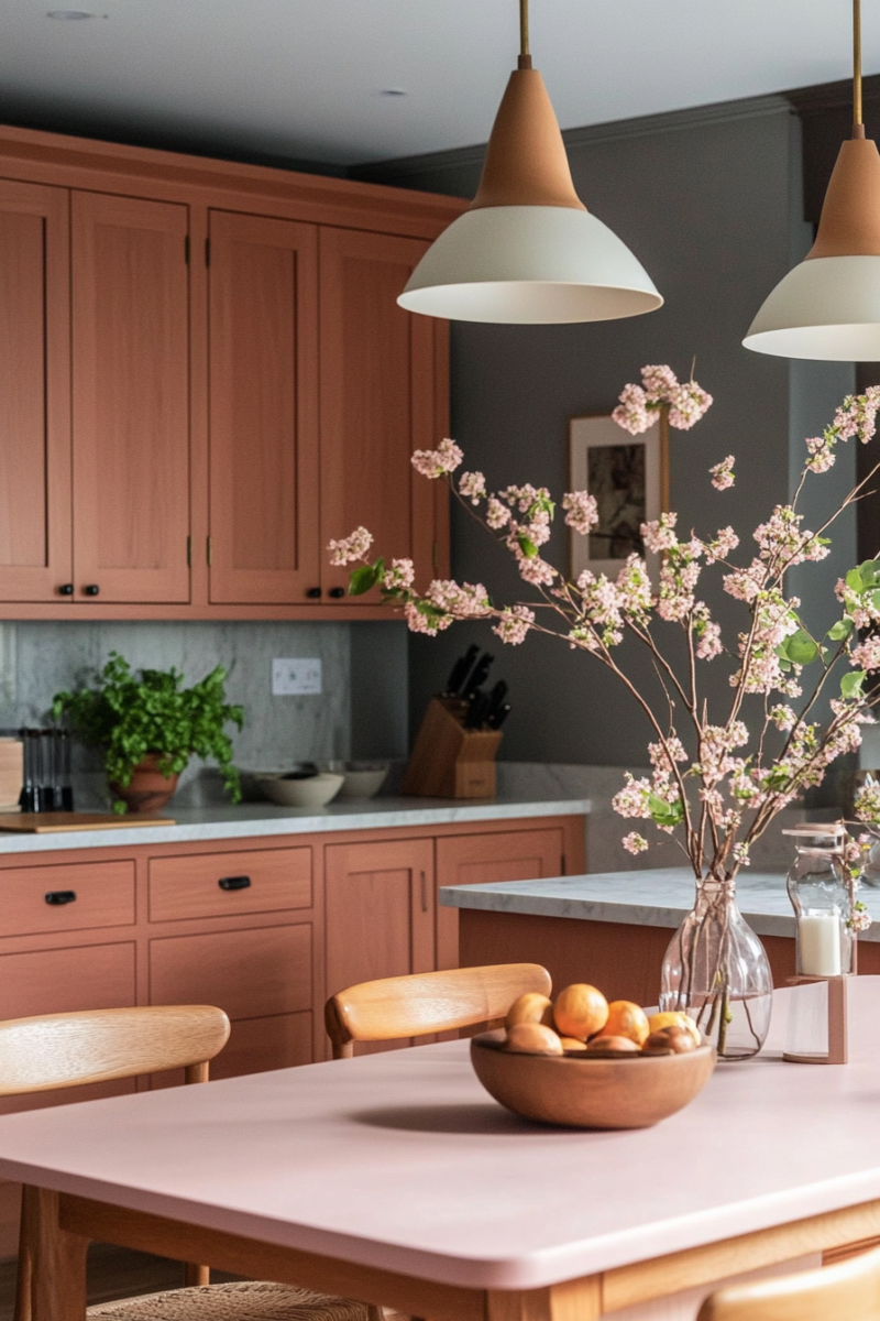 For a soft, unexpected twist, consider a blush pink table to pair with your cherry cabinets.