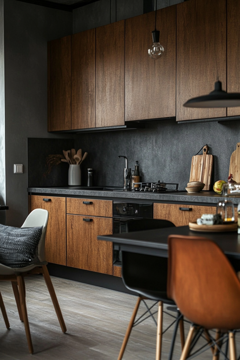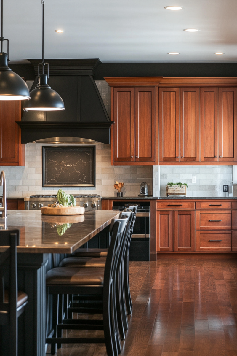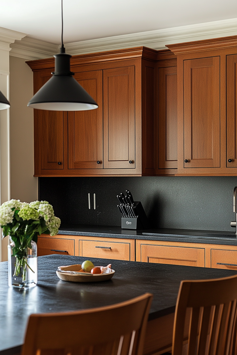 This deep, moody color creates a striking contrast with the warm tones of cherry wood, instantly elevating the sophistication of your kitchen.