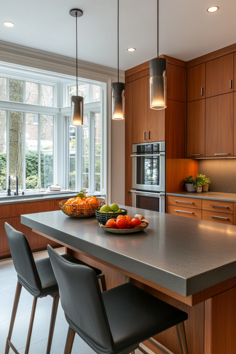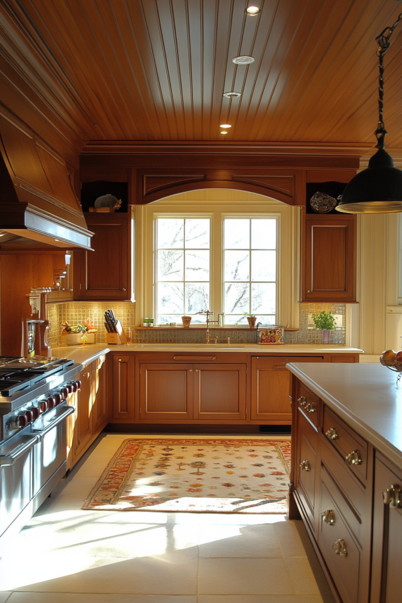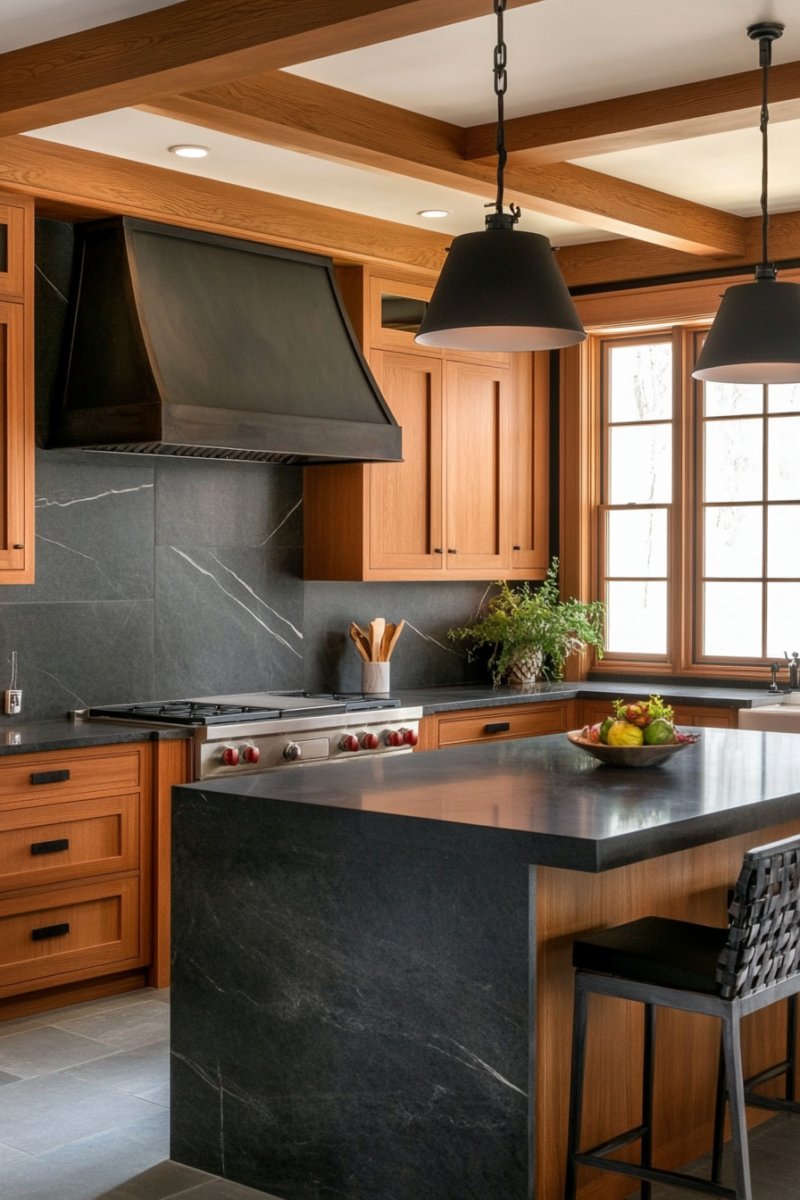 It’s a tone that enhances the natural richness of the cabinets while adding its own depth to the space.