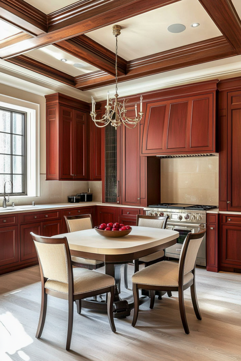 This color is perfect if you want your kitchen table to feel warm, welcoming, and full of character while staying true to the richness of your cherry cabinets.