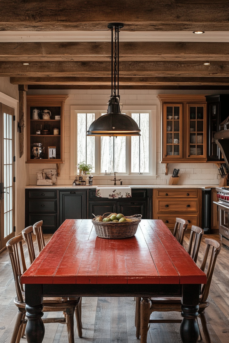 Pair your barn red table with natural wood or neutral-colored chairs to keep the overall look grounded and cohesive.