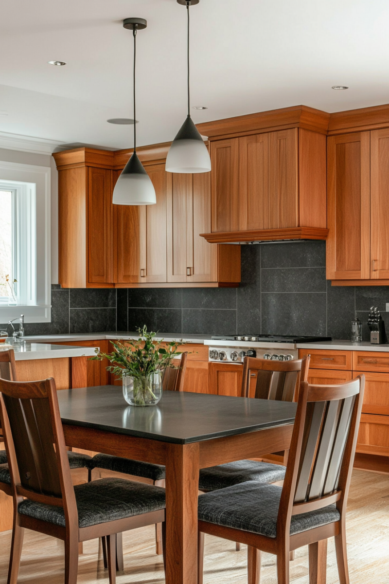 For a bold, dramatic look that exudes elegance, a charcoal black table is a stunning choice to pair with cherry cabinets.